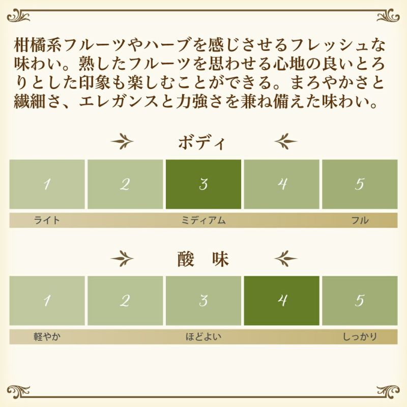 グリーンがかった淡いイエロー。柑橘系フルーツやハーブを感じさせるフレッシュな味わい。熟したフルーツを思わせる心地の良いとろりとした印象も楽しむことができる。まろやかさと繊細さ、エレガンスと力強さを兼ね備えた味わい。