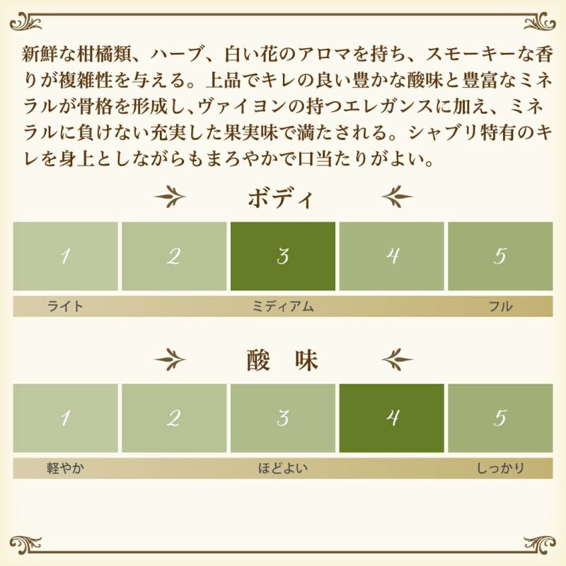 美しい黄金色。熟した白い果実や凛々しい美しい花を想わせるアロマティックな香りを持つ。キンメリジャン土壌をピュアに表現しており、果実味に溢れ、綺麗な酸味とともにミネラルな風味がフワッと口の中に広がる。余韻が長く厚みのある辛口。