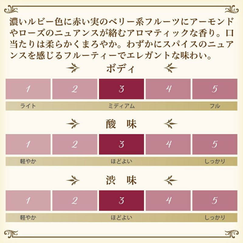 濃いルビー色に赤い実のベリー系フルーツにアーモンドやローズのニュアンスが絡むアロマティックな香り。口当たりは柔らかくまろやか。わずかにスパイスのニュアンスを感じるフルーティーでエレガントな味わい。