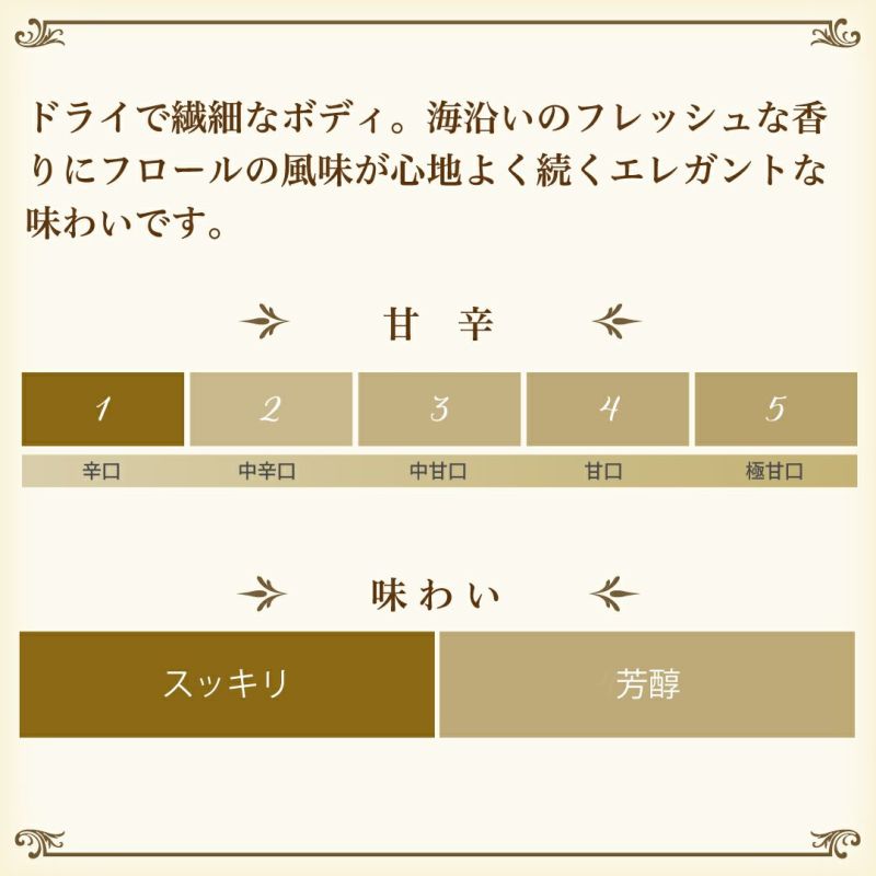 ドライで繊細なボディ。海沿いのフレッシュな香りにフロールの風味が心地よく続くエレガントな味わいです。