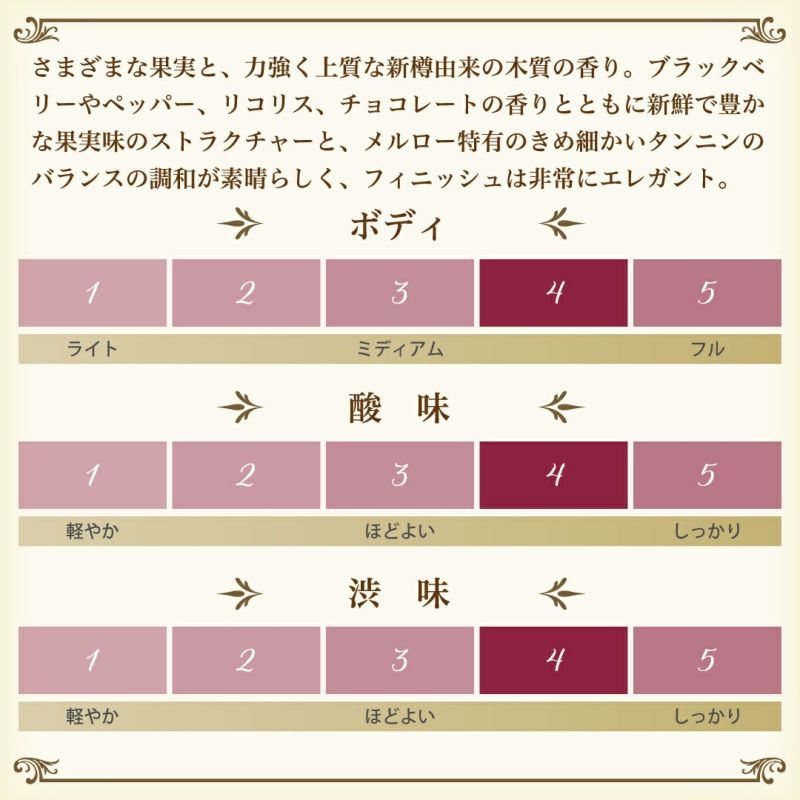 紫の色調の強い濃いチェリーレッド。さまざまな果実と、力強く上質な新樽由来の木質の香り。ブラックベリーやペッパー、リコリス、チョコレートの香りとともに新鮮で豊かな果実味のストラクチャーと、メルロー特有のきめ細かいタンニンのバランスの調和が素晴らしく、フィニッシュは非常にエレガント。