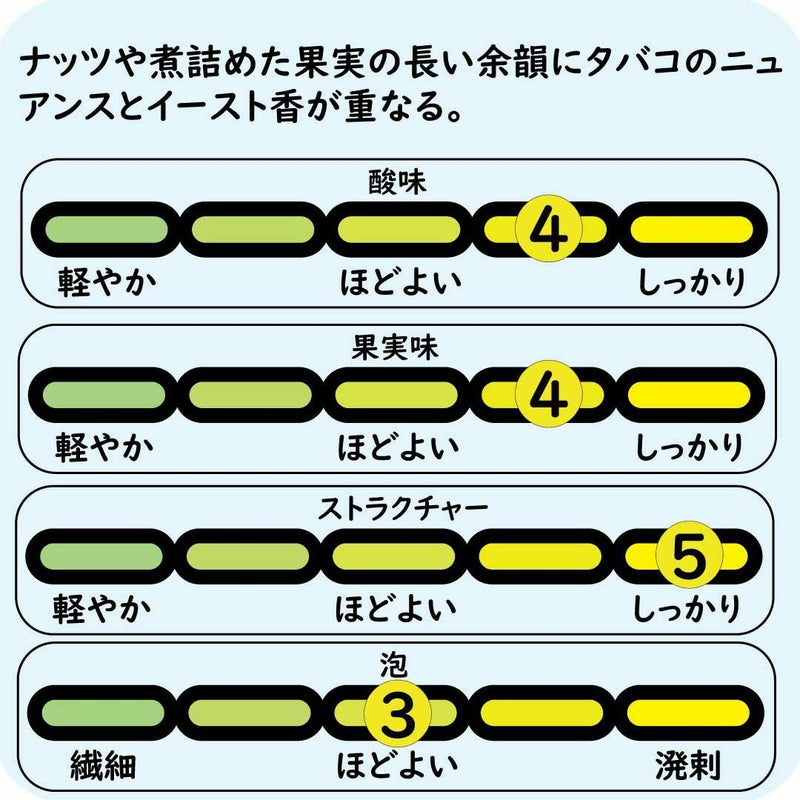 特級畑、1級畑の優雅さを表現する独特なアロマは2004と共通。新鮮さを残しながらも、しっかりとした味わい。ナッツやカラメライズしたフルーツの余韻が長く残る。タバコのニュアンスに温かいブリオッシュ、ホイップクリームの香りが重なる。ヴィンテージ好きをもうならせる、驚くべき複雑な味わい。