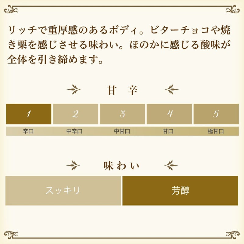 リッチで重厚感のあるボディ。ビターチョコや焼き栗を感じさせる味わい。余韻は非常に長く、ほのかに感じる酸味が全体を引き締めます。