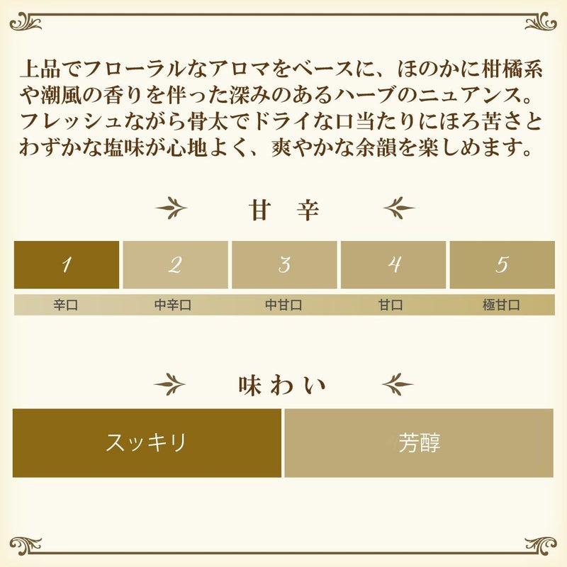 上品でフローラルなアロマをベースに、ほのかに柑橘系や潮風の香りを伴った深みのあるハーブのニュアンス。フレッシュながら骨太でドライな口当たりにほろ苦さとわずかな塩味が心地よく、爽やかな余韻を楽しめます。