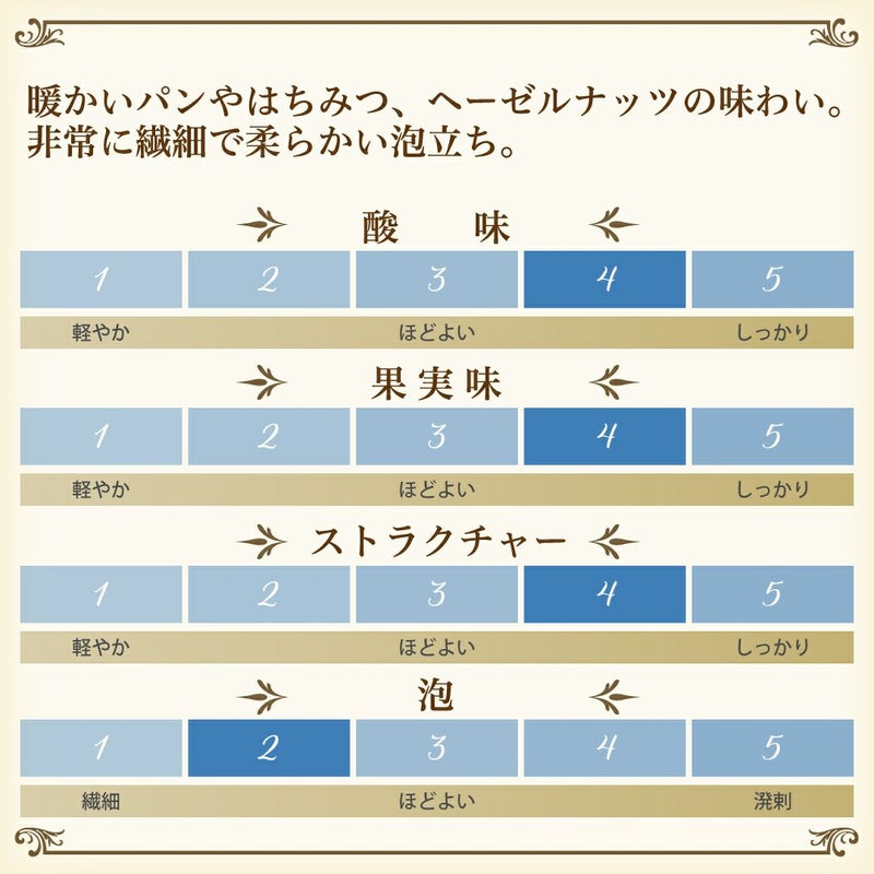 はちみつの香りとともに熟成香が広がる。温かいパンやヘーゼルナッツの味わい。細かい泡がきれいに溶け込み、非常に優雅で繊細な印象です。シュールリー(樽熟成)7年。特級畑、一級畑から収穫されたブドウのみを使用しています。