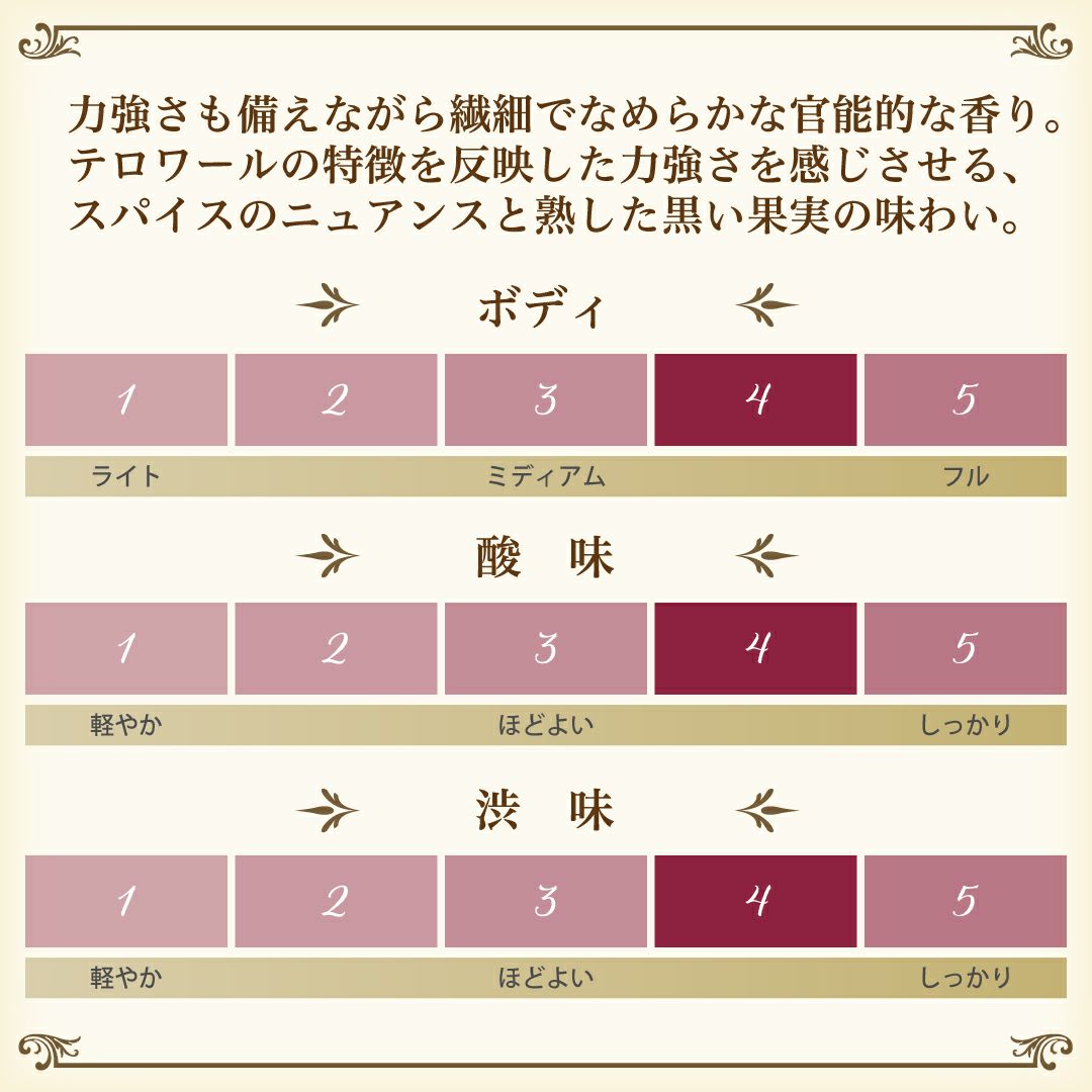 ガーネット色を帯びた深みのある濃い赤色。力強さも備えながら繊細でなめらかな官能的な香り。テロワールの特徴を反映した力強さを感じさせる、スパイスのニュアンスと熟した黒い果実の味わい。