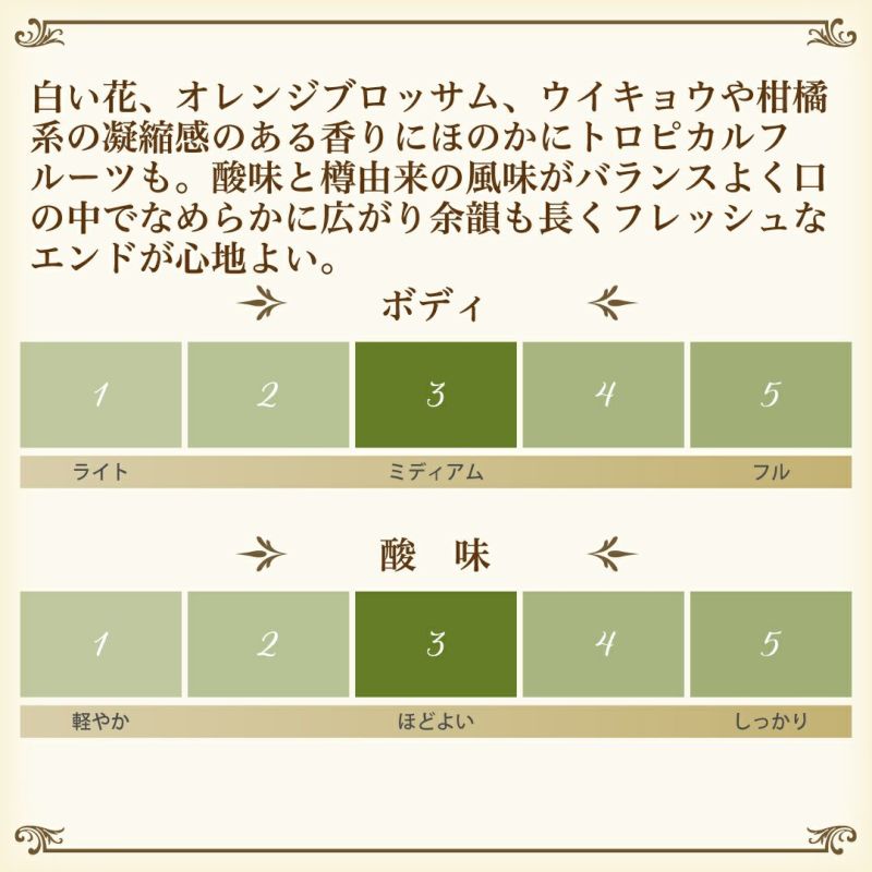 白い花、オレンジブロッサム、ウイキョウや柑橘系の凝縮感のある香りにほのかにトロピカルフルーツも。酸味と樽由来の風味がバランスよく口の中でなめらかに広がり余韻も長くフレッシュなエンドが心地よい。