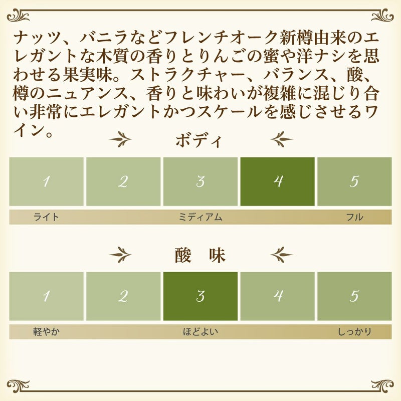 ナッツ、バニラなどフレンチオーク新樽由来のエレガントな木質の香りとりんごの蜜や洋ナシを思わせる果実味。ストラクチャー、バランス、酸、樽のニュアンス、香りと味わいが複雑に混じり合い非常にエレガントかつスケールを感じさせるワイン。
