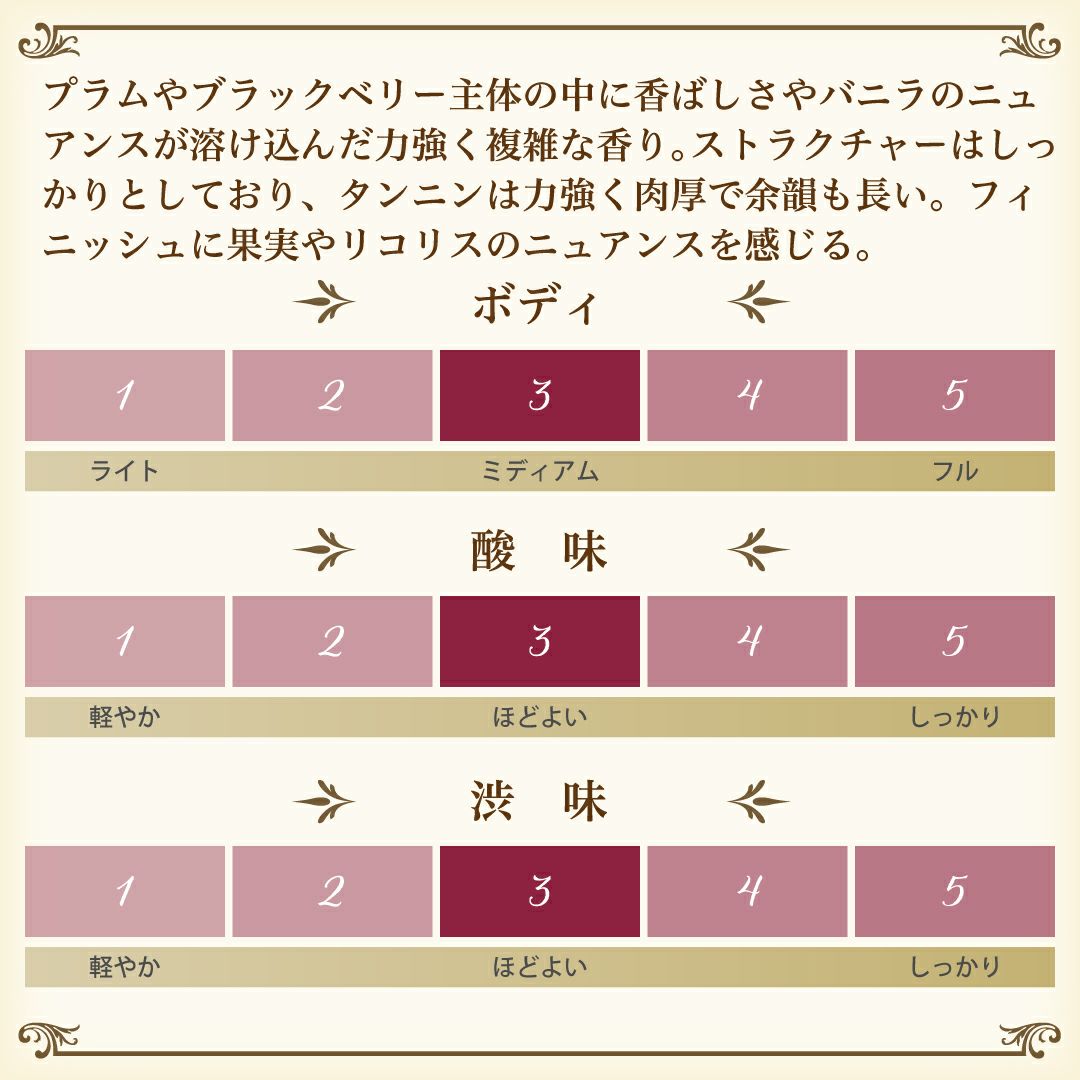 渋みがひかえめでコクがあり丸みを帯びたふくよかな味わいのため、どんな料理にも合わせやすいのが特徴です。ハンバーグなどやわらかくまろやかに仕上げた肉料理はもちろん、筑前煮などの和食ともよく合うため、日本の食卓でも使い勝手の良いワインです。