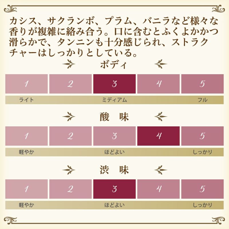 カシス、サクランボ、プラム、バニラなど様々な香りが複雑に絡み合う。口に含むとふくよかかつ滑らかで、タンニンも十分感じられ、ストラクチャーはしっかりとしている。 ブルーベリーやナツメグのニュアンスがアクセントになっている。上質の酸が高くワインの中心にあるので肉料理を食べても重く感じません。軽めのソースにしてラムや鹿肉のベリーソースは本場さながらのワンランク上のワインの味わいに。
