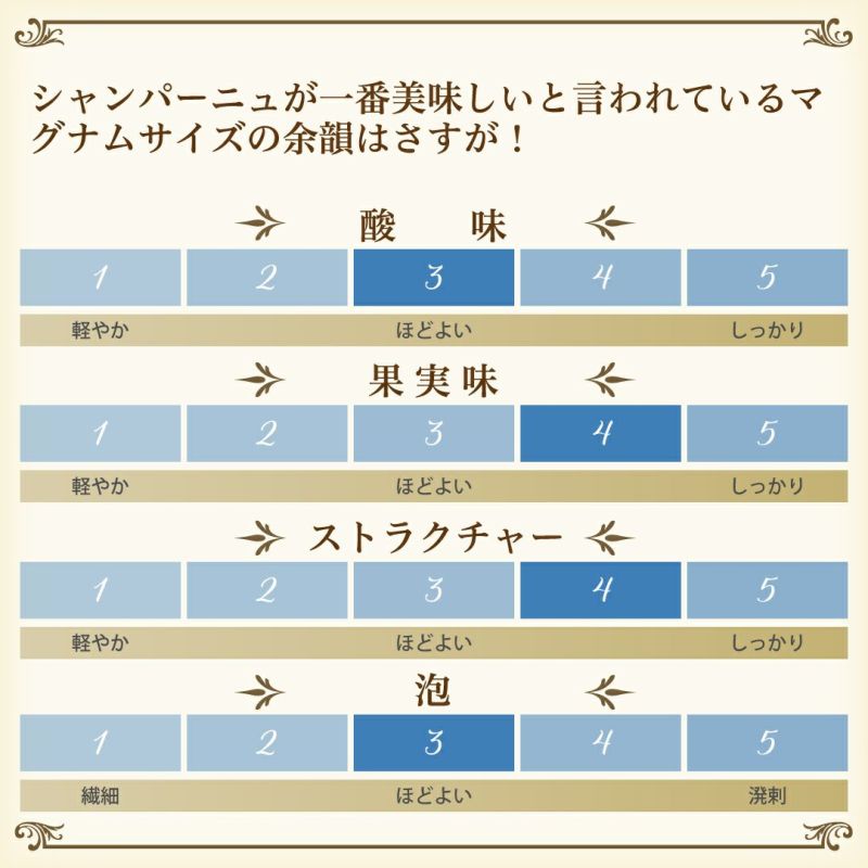 輝きのある麦わら色、きめ細やかな泡立ち。ブリオッシュやココアビーンズ、ヴァニラにピンクグレープフルーツのアロマが重なります。フレッシュで骨格があり、トーストやオークの香りと共に余韻が広がります。メゾンの特徴が最も端的に表現されています。
