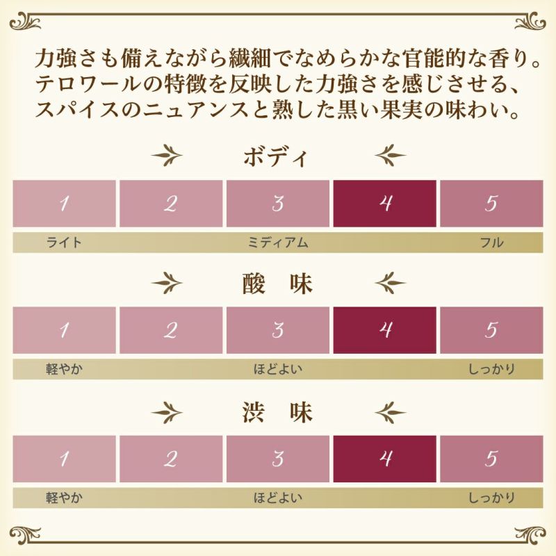 ガーネット色を帯びた深みのある濃い赤色。力強さも備えながら繊細でなめらかな官能的な香り。テロワールの特徴を反映した力強さを感じさせる、スパイスのニュアンスと熟した黒い果実の味わい。