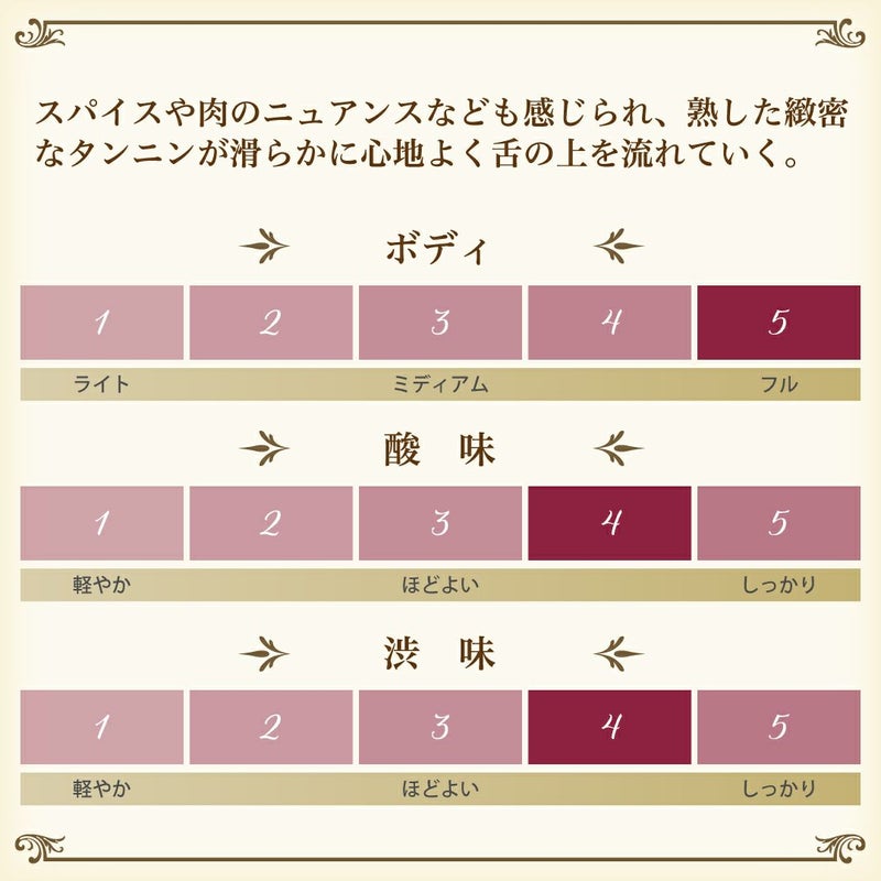 熟した黒系果実、オーク由来のタバコやスモーキ-な香り。アタックは生き生きと広がりがありフレッシュ、緻密でしなやかなタンニンが心地よい。ぶどうの個性をはっきりと感じながら調和のとれた長い余韻へと続く。