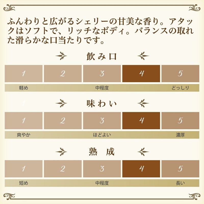 ふんわりと広がるシェリーの甘美な香り。アタックはソフトで、バランスの取れた滑らかな口当たり。とてもリッチなボディ。長期熟成による複雑で深い味わいの余韻へと続きます。