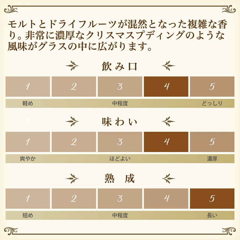 濃厚な1stフィルからライトな4thフィルまでの原酒を巧みに使い分け、シェリー樽シングルモルトのさまざまな魅⼒を表現しています。