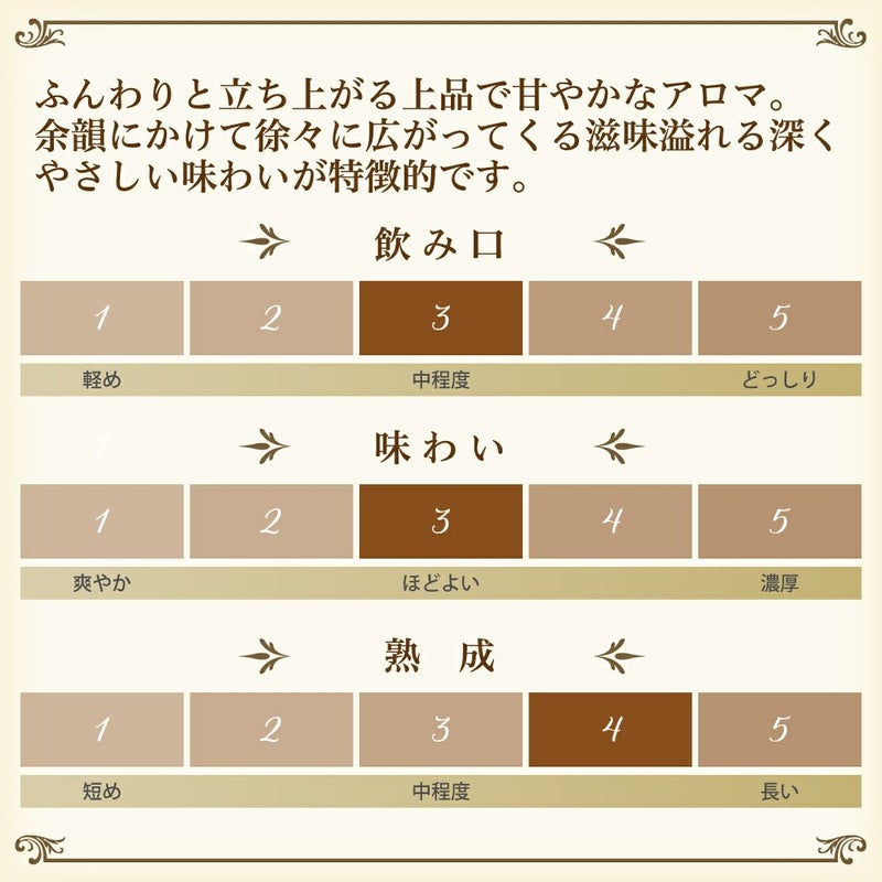 ふんわりと立ち上がる上品で⽢やかなアロマ。フレッシュなリンゴのような爽やかな香りと、繊細な、しかしはっきりと感じられる優雅なシェリーの甘み。滋味溢れる深くやさしい味わいが、余韻にかけて徐々に広がります。