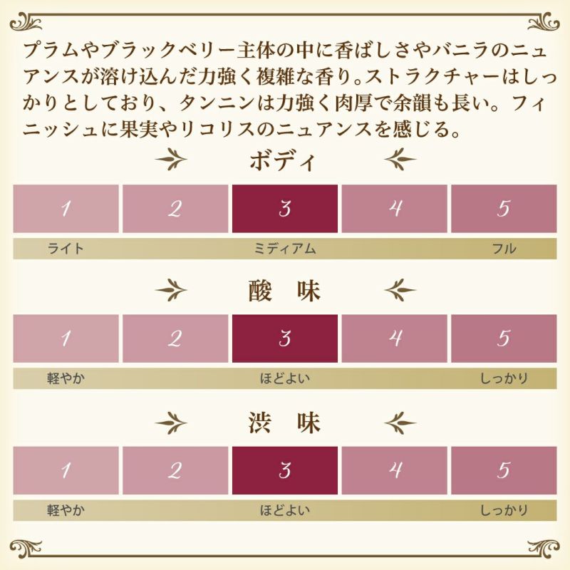 プラムやブラックベリー主体の中に香ばしさやバニラのニュアンスが溶け込んだ力強く複雑な香り。