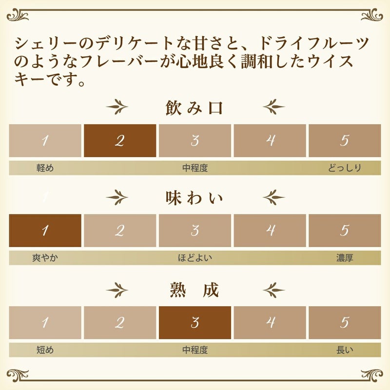 シェリーのデリケートな甘さと、ドライフルーツのようなフレーバーが心地良く調和したウイスキー。優しい味わいで飲み口もスムーズなので、ウイスキーの入門としても最適です。