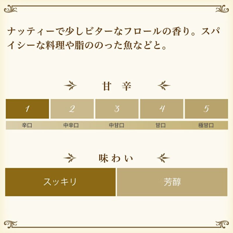 港町エル・プエルト・デ・サンタ・マリアで熟成されたフィノ。ナッティーで少しビターなフロールの香り。スパイシーな料理や脂ののった魚などと。