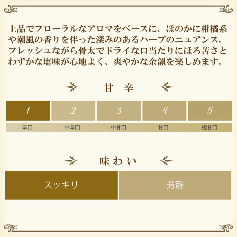 上品でフローラルなアロマをベースに、ほのかに柑橘系や潮風の香りを伴った深みのあるハーブのニュアンス。フレッシュながら骨太でドライな口当たりにほろ苦さとわずかな塩味が心地よく、爽やかな余韻を楽しめます。