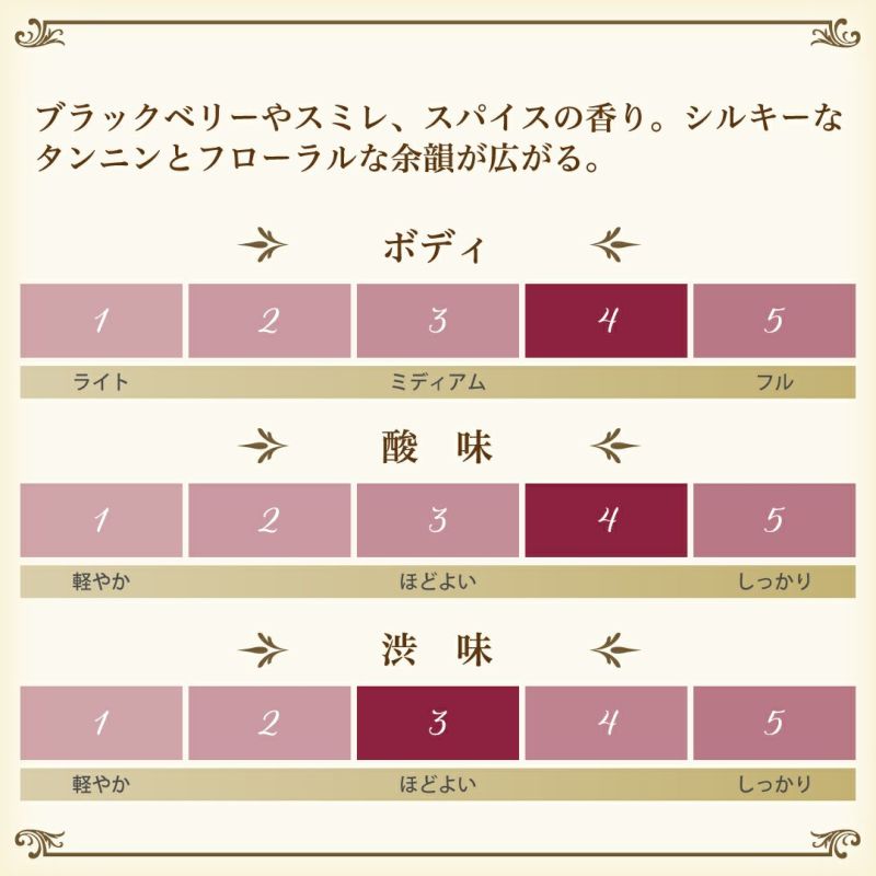 フレッシュな赤い果実、タイムやローズマリーの香り豊か。口に含むと熟した赤系、黒系果実の凝縮感と共にフレッシュでボリュームも感じられる。バランスがよくシルキーなタンニンにミネラル感のある余韻。エレガントで全体的にフレッシュにまとまっている。