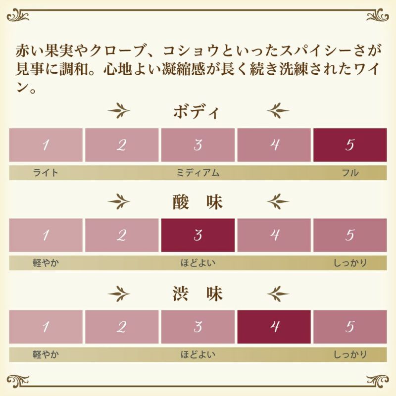 深みのある赤い果実にバターのような香りも。シルキーなタンニンはワインの持つ酸やクローブ、コショウといったスパイシーさと見事に調和している。ビロードのような心地よい凝縮感が余韻まで長く続き洗練された熟度の高いワイン。