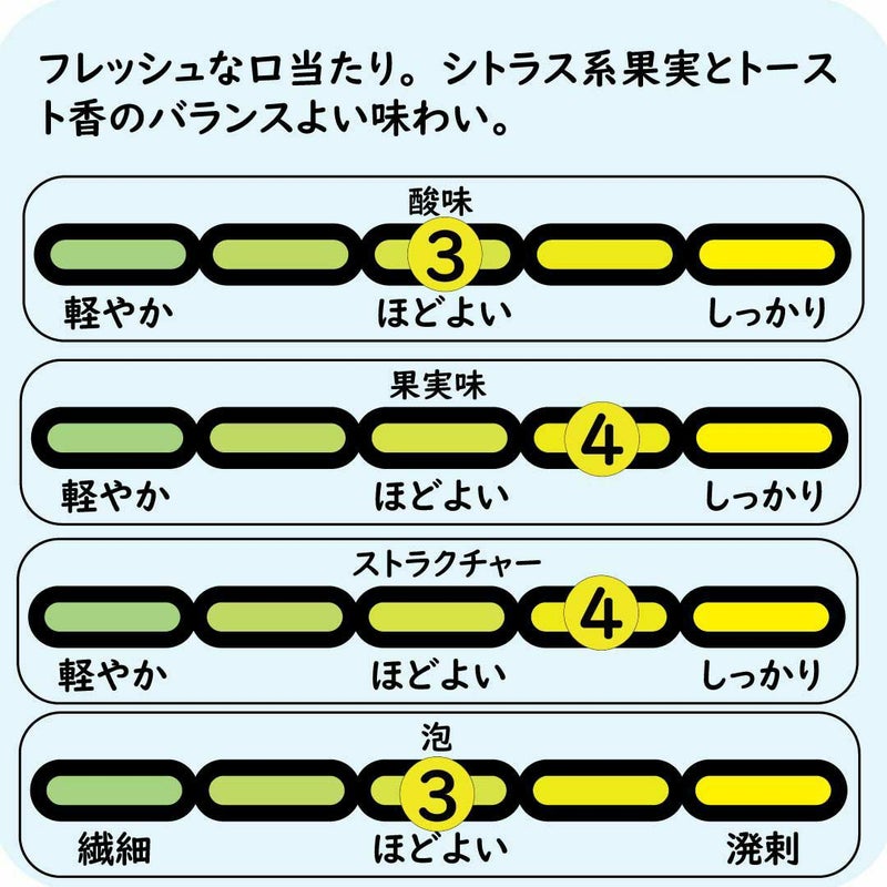 輝きのある麦わら色、きめ細やかな泡立ち。ブリオッシュやココアビーンズ、ヴァニラにピンクグレープフルーツのアロマが重なります。フレッシュで骨格があり、トーストやオークの香りと共に余韻が広がります。メゾンの特徴が最も端的に表現されています。