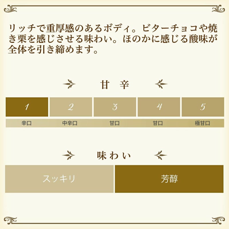 リッチで重厚感のあるボディ。ビターチョコや焼き栗を感じさせる味わい。余韻は非常に長く、ほのかに感じる酸味が全体を引き締めます。