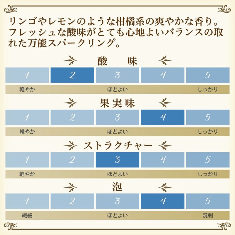 レモンイエローの色合い。美しい泡立ち。リンゴやレモンのような柑橘系の爽やかな香り。