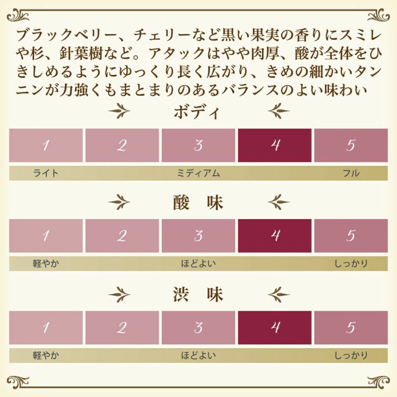 ブラックベリー、チェリーなど黒い果実の香りにスミレや杉、針葉樹など。アタックはやや肉厚、酸が全体をひきしめるようにゆっくり長く広がり、きめの細かいタンニンが力強くもまとまりのあるバランスのよい味わい。