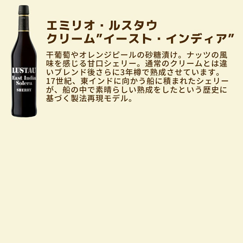 | クリーム”イースト・インディア” | タイプ:クリーム 生産者名:ルスタウ 原産国:スペイン 地方・地区:ヘレス・デ・ラ・フロンテラ セパージュ (ブドウ品種):パロミノ80%、ペドロ・ヒメネス20% アルコール度数:20度 平均熟成年数:15年 提供温度:10-12度 pH:3.3 揮発性酸(Volatile Acidity):0.50 総酸度(Total Acidity):5 残糖量(Residual sugar):134/ℓ 容量:500ml キャップ:コルク 保存方法:冷暗所に保管 未開封:3年 開封済:10ヶ月 受賞歴等:21st Grand International Wine Award MUNDUS vini Gold Meininger 2017 IWSC .net 2020 Silver Decanter world wine awards Silver 甘辛:極甘口 味わい(全体的な印象):芳醇 |