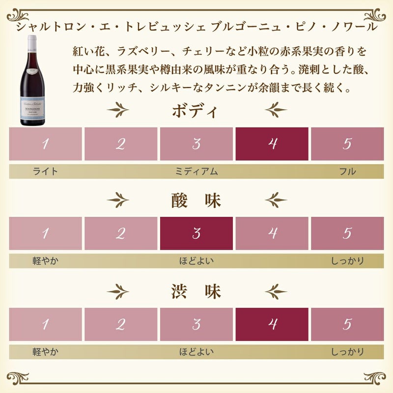 | ブルゴーニュ・ピノノワール2022 | タイプ:赤 ヴィンテージ(年号):2022 生産者名:シャルトロン・エ・トレブッシェ 原産国:フランス 地方・地区:ブルゴーニュ 格付:AOCブルゴーニュ セパージュ (ブドウ品種):ピノノワール100% アルコール度数:12.5度 容量:750ml キャップ:コルク 保存方法:冷暗所に保管 |