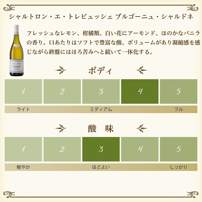 | ブルゴーニュ・シャルドネ2022 | タイプ:白 ヴィンテージ(年号):2022 生産者名:シャルトロン・エ・トレブッシェ 原産国:フランス 地方・地区:ブルゴーニュ 格付:AOCブルゴーニュ セパージュ (ブドウ品種):シャルドネ100% アルコール度数:12.5度 容量:750ml キャップ:コルク 保存方法:冷暗所に保管 |
