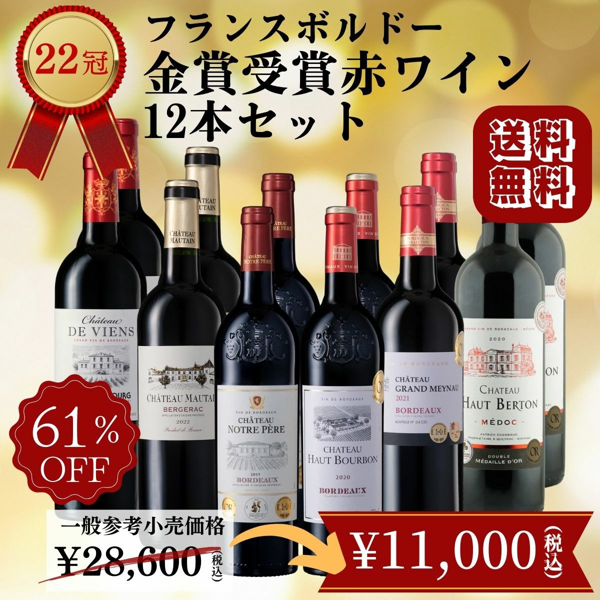 他の画像を見る 送料無料!!「22冠!!フランスボルドー金賞赤ワイン12本セット」750ml/12本 セット 送料無料 750ml×12 割引除外品 包装不可 クール便発送可 通常販売価格 ¥ 28,600 販売価格 ¥ 11,000 税込 大好評!フランスボルドー金賞赤ワイン12本セット!